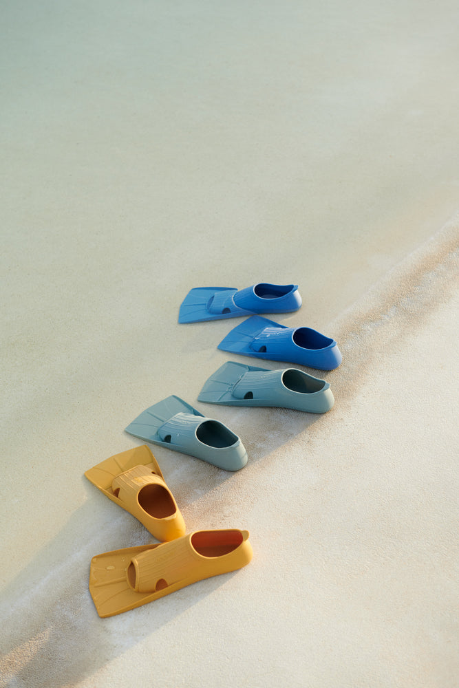 Ein Paar Schwimmflossen ist eine grossartige Schwimmhilfe, um Vertrauen im Wasser zu gewinnen. Die Gustav Schwimmflossen machen das Schwimmen zum Kinderspiel, und ihre geprägten Sohlen hinterlassen winzige maritime Figuren im Sand.