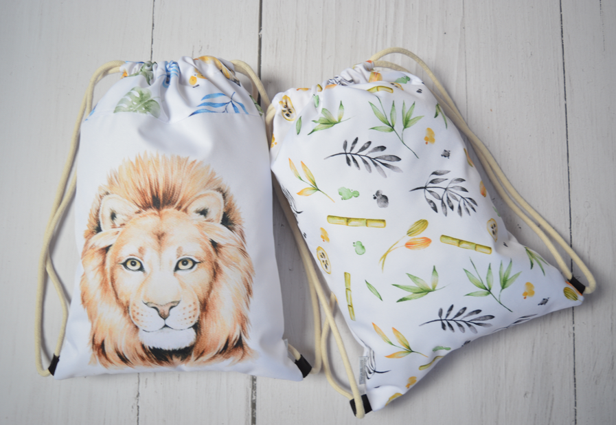 Turnsack mit wunderschönen Tierprint auf der Vorderseite und Pflanzen auf der Rückseite.